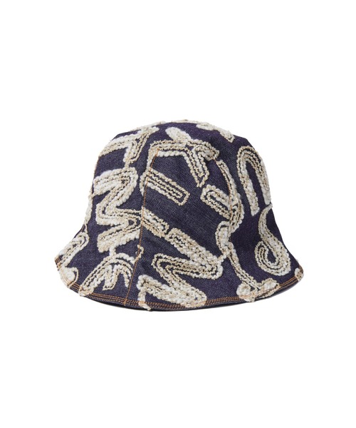 共地のジャケット&ショーツと同様、UEを構成するアルファベットをコード刺繍によりランダムに配したデニムを採用した深めのチューリップハット。リバーシブル仕様のため、裏返して被れば微光沢の黒のローン生地にブランドネームタグだけが施されたシンプルなルックスもお楽しみいただけます。