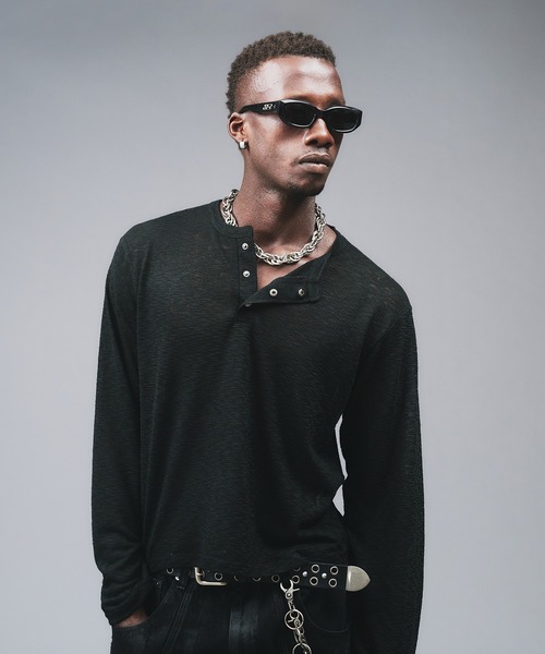 【ANDER HUNK/アンダーハンク】 グランジムードを中心にトレンドをミックスさせたストリートウェアブランド 新作情報は公式アカウントからチェック! ↓ Instagram【@anderhunk_official】 ---------------------------------------------- 【 ATTENTION 】 ・アテンションタグや洗濯表示を必ずご確認の上、ご使用下さい。 ・液温は30 ℃を限度とし、洗濯機で非常に弱い洗濯ができる ・塩素系及び酸素系漂白剤の使用禁止 ・タンブル乾燥禁止 ・日陰のつり干しがよい ・底面温度120 ℃を限度としてアイロン仕上げができる ・石油系溶剤による弱いドライクリーニングができる ・弱い操作によるウエットクリーニングができる ・移染しやすいので他の物と分けて洗って下さい。 ・洗濯ネットを使用して下さい。 ・アイロン時はあて布をして下さい。 ・汗や摩擦(特に湿った状態)により色が移る場合があります。他の衣類との組み合わせにご注意ください。 ・長時間濡れたままにしておくと、色が落ちる恐れがあります。洗濯後は形を整えて直ぐに干して下さい。 ・他のものとの引っかかりにご注意下さい。 ---------------------------------------------- トレンドのヘンリーネックデザインのシアートップス メタルボタンを使用しハードな印象に。 今の時期は、室内の冷房対策になるシアートップス。 秋口まで長く着用頂けます。 ---------------------------------------------- ※モデル写真はサンプルにて撮影を行い、ビジュアルイメージの為に画像加工を行っております。お届けする実際の商品と仕様が異なる場合がございますので、商品詳細画像を必ずご確認の上ご購入ください。 ※ご覧のモニター環境や撮影環境により、実物の商品と多少色味が異なって見える場合がございます。 また表示のサイズ感と実物は若干異なる場合もございますので、予めご了承ください。 ※サイトに表示されているカラー名と実際のお届け商品に記載されているカラー名が異なる場合がございます。 ----------------------------------------------- 【 SHOPPING 】 ▼商品のお気に入り登録をクリック 再入荷やラスト1点、セール等の通知を受け取ることが出来ます。 ▼ブランド (ANDER HUNK) のお気に入り登録 最新のブランド情報を受け取ることが出来ます。