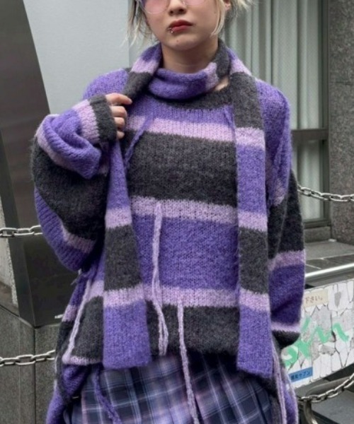 モヘアライクな糸を使用しローゲージで程よく透け感がある編み地に仕上げた ストール付きニットトップス。チクチクしない柔らかい質感で肌触りも◎ ランダムに垂らしたフリンジでアクセントをプラスしました。 オーバーシルエットでトップスとしてはもちろん、1枚でワンピース風な着こなしもオススメ。 マルチボーダーボーダー2色と、ライトブルー(無地)の3色展開。 ストリートなスタイリングはもちろん、キャミソールワンピースなど女性らしいアイテムとも相性抜群。 程よい肌見せをお楽しみいただける秋のレイヤードスタイルに最適な1枚です。 ・・・・・・・・・・・・・・・・・・・・・・ ・透け感:あり ・伸縮性:あり ・生地の厚さ:薄い ・裏地:なし ・・・・・・・・・・・・・・・・・・・・・・ ・ライトブルー/水色、グレー×ネイビー、チャコール×ラベンダーの3色展開 #カジュアル#ボーダー#ユニセックス#メンズライク#キャンスパ#キャンスト ●Candy Stripper/キャンディストリッパー● -BRAND CONCEPT- NO RULE, NO GENRE, NO AGE 年齢や性別にとらわれず、自由に自分を表現出来る服 【お買い物をもっとお楽しみ頂くために】 ▼商品のお気に入り登録▼ 完売カラーの再入荷通知や、ラスト1点通知、プライスダウンしたセール通知も受け取れる♪ ▼ブランドのお気に入り登録▼ 新作や再入荷等、いち早くブランドのお得な情報が受け取れる♪