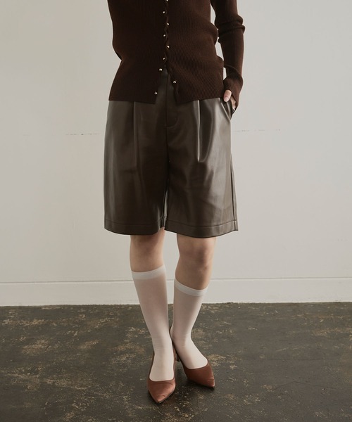 素材とシルエットにこだわった大人のハーフパンツ ■Fabric トレンド感◎のオーバーサイズのハーフパンツ。 柔らかいヴィーガンレザーを使用しており、履き心地も快適なのが嬉しい1着。 少し長めの丈が着こなしやすく、今っぽく見せてくれるポイントです。 フロントのタックがさりげなくアクセントになり、トップスインのスタイリングもこなれた印象に。 バックウエストはゴム仕様なので窮屈感なく着用いただけます。 ■Style 脚のラインを拾わないシルエットなので、細身のトップスからボリュームのあるニットやアウターまでトップスを選ばない優秀ボトム。 シアーソックスで抜け感のあるスタイリングや、レースタイツを合わせて女性らしくヴィンテージ感のあるコーディネートもおすすめです。 パンプスからブーツまで足元のバランスを気にせず着用いただけます◎ 166cm(着用サイズ:Sサイズ) 160cm(着用サイズ:Sサイズ) 168cm(着用サイズ:Sサイズ)※ショートヘア ------------------------------------- 透け感:なし 伸縮性:なし 厚み:普通 洗濯:不可※軽度な汚れは水または中性洗剤を布に湿らせてふき取ってください。 -------------------------------------- ※商品の特性上、色落ち・色移りがある場合がございます。品質表示をご確認の上、お取り扱いにはご注意くださいませ。 ※撮影時のライティング、ご覧になっているモニター・PC環境により実際の商品と色味が異なって見える場合がございます。ご了承の上お買い求め下さい。 ※サンプルにて撮影をしている為、色味や仕様、サイズ等に若干の変更がある場合がございます。予めご了承ください。
