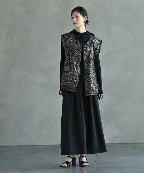 生地に柄を織り込んだベスト。 キレイめコーデにも取り入れられて 使いやすく、ベストとして羽織りにするのはもちろん 前を閉じてトップス風にも使えます。 着丈をおしりが隠れるくらいの長めに設定し 下腹部や背中などもカバーしてくれるという嬉しい効果も。 手持ちのお洋服を味変してくれる プラスアイテムになっています。 また、デザインのポイントとして 前と後ろにDカンをつけどちらに紐をつけていただいても または取り外してお使いいただいても◎ 裾部分はドロストになっているので 絞ってバルーンぽく着れます。 ポッケットは左右非対称な位置につけ 一癖も二癖もある一着。 セットアップでご着用いただけるように 同生地でパンツもおつくりいたしました。 パーティーシーンやオケージョンなどにも おすすめです! 注意事項 *撮影場所やイメージにより 実際の商品と色味が 若干異なる場合がございます。 商品のお色味は カラーバリエーション画像を ご参照ください。