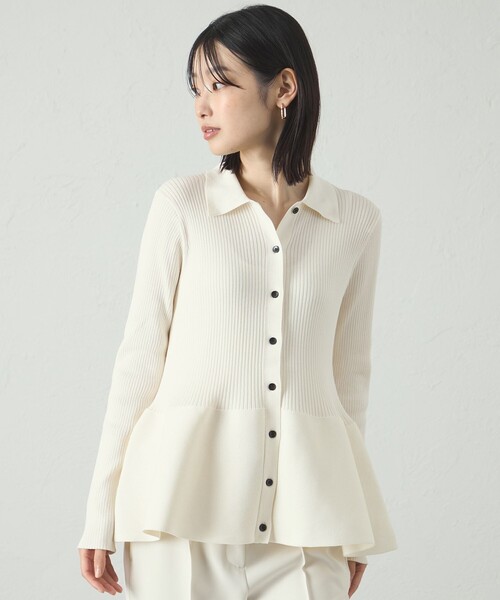 【CAST:キャストコロン 2025年秋冬アイテム】【Design】襟付きのペプラムデザインニット。身頃はリブ組織で伸縮性があり、着心地抜群。裾はしっかりとした編地で、身頃とのコントラストを効かせています。配色ボタンがデザインポイントになっています。【Fabric】綿・ポリエステルをブレンドした、綺麗な発色となめらかな肌触りで、ストレッチ性のあるニット素材です。上品な光沢感も魅力です。【Styling】1枚着としてはもちろん前を開けて羽織りとしても活用できます。全体のバランスがとりやすいデザインで、パンツにもスカートにも合わせやすいボリューム感にしています。●洗濯:手洗い可透け感:なし※オフホワイトはややあり伸縮性:あり生地の厚さ:普通おすすめ着用期間:春、秋、冬※この商品はサンプルでの撮影を行っています。実際の商品とイメージ、サイズ、品質表示、原産国等が異なる場合がございます。※店頭及び屋外での撮影画像は、光の当たり具合で色味が違って見える場合があります。商品の色味は、スタジオ撮影の画像をご参照ください。