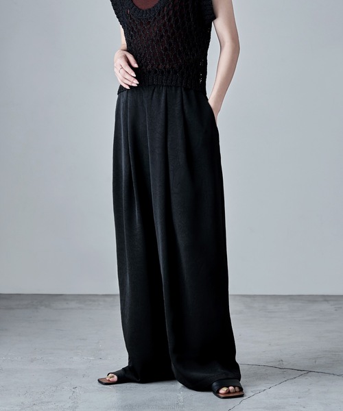 美形なカジュアルボトム。 ヴィンテージライクな光沢感が美しいマットサテン生地で仕上げたワイドパンツ。 表面に抑揚が生まれるサテンならではの柔らかさととろみのある風合いで、落ち感が美しいシルエット。 脚線を拾わないワイドレングスに、前面に施したタックデザインが腰回りのボリューム感をカバーしてくれます。 光の反射で濃淡が変わり、スタイリングに奥行きをもたらしてくれるワッシャー加工で華やかさもそこなわず、 ドレスライクな質感でラクして品がいい大人顔の一着です。 etoll. 「For me.」 気ままに自由な服選びで、私だけのファッションを楽しむ女性へ捧げるセレクトショップ。 系統に捉われず、気分を高めたい日や特別な日、 いつでも私の好きを身につけましょう。 自分自身のためにお洒落をしたい気持ちを大切に、 豊かな個性とトレンドを取り入れたアイテムで、少しだけお手本になるようなスタイリングを提案します。 【備考】 ・ポケットあり ・伸縮性なし ・裏地なし ・透け感なし ・洗濯可