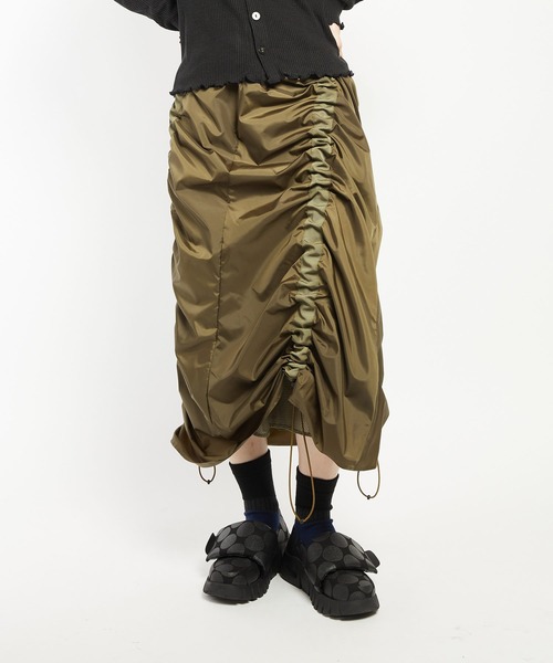 2025-26 AUTUMN&WINTER COLLECTION ■design ・個性的なシルエットが魅力的なスカート。 ・斜めに3本走るドロストでシルエットを変えられます。 ・コードを絞れば立体的なドレープが生まれ、動きのある印象に。 ・ストレートに伸ばしてすっきりとしたIラインで着こなすのもおすすめです。 ・ウエストは総ゴムでリラクシーに着用可能 ■fabric ・軽量でハリのある風合いが特徴的のテキスタイル。 ・裏地にはメッシュを用いております。 ■coordinate ・トップスはインでもアウトでもバランス◎ ・Tシャツを合わせてカジュアルフェミニンスタイル。 ‥‥‥‥‥‥‥‥‥‥‥‥‥‥‥‥ 厚さ:薄手 透け感:なし 伸縮性:なし 光沢感:あり ポケット:なし 裏地:あり ※詳しいお手入れ方法は商品タグをご参照ください。 ‥‥‥‥‥‥‥‥‥‥‥‥‥‥‥‥ 《お知らせ》 ・商品画像はご覧のモニター環境により、実物の色味と多少異なる場合がございます。予めご了承ください。 ・「商品のお気に入り登録」で再入荷・値下げ・在庫1点などの通知を受け取ることができます。 ・「ブランドのお気に入り登録」で新商品や再入荷など、お得な情報を受け取ることができます。 ※他のキャンペーンにより、期間中に価格が変動する場合があります。 ※セールは予告なく終了させて頂く場合もあります。