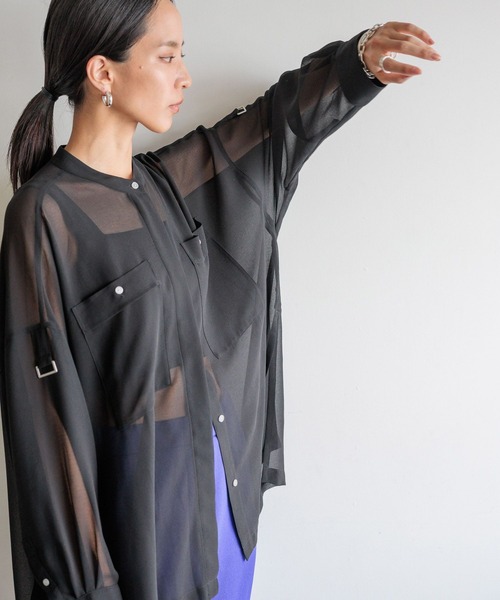 真夏から秋まで着まわせる、活躍度★★★★★の万能シアーシャツ。 ーーー ★おすすめポイント★ [1]秋まで長く使える、シアーシャツ [2]落ち感素材で着膨れ回避 [3]袖タブで袖丈調整可能 [4]オフィスでも涼しくきちんと感 [5]シワにならない、ポリエステルジョーゼット ーーー [fabric] 強撚糸で織り上げ、シボ感を出したジョーゼット素材。 細かな凹凸がありサラサラとした肌触りで、暑い時期でも身体に張り付かず快適。 ポリエステル素材で乾きやすく、しわになりにくいのも日常使いに嬉しいポイント。 [design] ゆったりとしたシルエットのシャツは、落ち感とシアー感で女性らしく着用できるデイリーな1枚。 袖丈調整機能により、晩夏から着用しやすく長期着用が叶います。 また、涼しげな印象ながら強い紫外線から肌を守る夏の羽織としても便利。 [styling] 落ち感があるので着膨れせず、どんなボトムにも合わせやすい1枚。 ノースリーブアイテムにゆるっと羽織れば、真夏から無理なく着まわせます。 ※屋外での撮影画像は光の加減で実際の商品より明るく見えたり、風合いが異なって見える場合がございます。 商品の色味はスタジオ撮影の画像を参考にして下さい。 ------------------------------------- ≪お買い物をよりお楽しみいただくために≫ ◆商品のお気に入り登録(ハートマークをクリック) 完売カラーの再入荷通知や、完売間近の通知、セールの通知も受けることができます。 ◆ブランドのお気に入り登録 新商品や再入荷など、いち早くブランドのお得な情報を受け取ることができます。 -------------------------------------