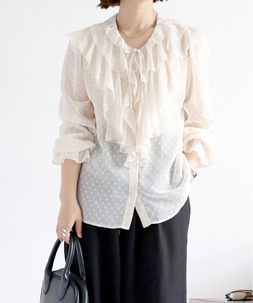 上品な”大人可愛い”が叶う、ドット柄のシアーフリルシャツ♪ドット柄とフリルが大人フェミニンな印象、さらにシアーで暑い夏でもさらっと着れちゃう☺︎◇Point◇大きな胸元のフリルが可愛く腕のシルエットをすっきり見せてくれるブラウス♪透け感のある生地に可愛いドットが全面にたっぷり入っていて、このちいさめなドット柄が、大人な女性を演出してくれますよ♪10代から大人の女性まで幅広い年齢層の方に着用して頂けます。袖はフェミニンな印象を与えてくれる、キャンディースリーブ♪長袖で着用はもちろん、キュッと袖まくりして着用するのもおしゃれ♪これ1枚で大人可愛いが完成します!気になる二の腕もまるっとカバーしてくれるのも嬉しいポイント。サラッとしているのでロングシーズンで着用できる、清涼感のあるブラウスです。◇Material◇・ポリエステル100%のサラッと着心地良い素材。シワになりにくいイージーケア!・シアー感たっぷりなので1枚で高級感を演出・フロントはボタンなので、カーディガンのように羽織りとしても☺︎・襟元についたリボンでフェミニンさUP☆・袖口のディティールがポイント♪キャンディなので袖をまくっての着用も◎・ご家庭での洗濯が可能です(洗濯ネットをご使用ください)。◇Coordinate◇1枚で主役にあるシャツブラウス。ブラウス1枚で、大人可愛いが完成します。フロントのボタンを開けて、カーデっぽく着るのもおすすめです☺︎デザイン性の高いシャツなので、スッキリとした様々なボトムとも合わせられます。トレンドのモノトーンコーデにも取り入れやすい1着。キレイめに合わせるならタイトスカートやワイドスラックスで。結婚式二次会やオフィスカジュアルなどのオケージョンコーデにも対応できます!※照明や天候により実際の色味と異なって見える場合がございます。ご了承くださいませ。【キーワード】#Y2K#10代#20代#30代#40代#50代#レース#大人可愛い#シアー#半袖#クロップド#夏コーデ#ドット柄#リボン#シアーシャツコーデ#ブラックコーデ