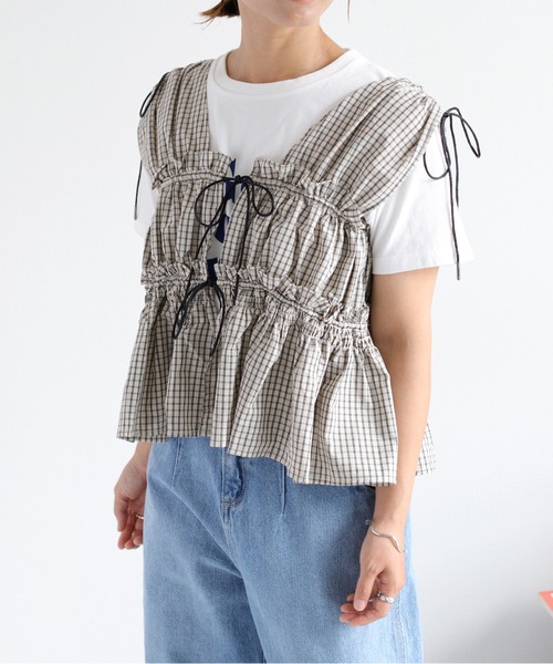 リボンとシャーリングがたっぷり入ったフリルベストに新色のチェック柄が登場♪肩とフロントのリボンがフェミニンな女性らしい雰囲気を演出してくれます☺︎どこから見られても、360度可愛いアイテムです♪◇Point◇「可愛い〜」思わず声がこぼれちゃうチェック柄のフリルベスト!どの角度から見ても、お洒落上級者見え◎たっぷり入ったシャーリングに目が行くので体型カバーにもなりますよ♪裾にかけてふんわり広がるデザイン。ウエストもゆったりしているので、お出かけ時や長距離の移動も心地よく着用して頂けます☺︎フロントは2本のリボンコードを結んで閉じる仕様です。前を開けて着用するのもとってもオススメです☺︎この商品はCFL-3680(フリルシャーリングベスト)と同デザインの新色です。素材をコットン100%に変え、秋らしい素材感に仕立てています。夏はタンクトップや半袖Teeで、秋はロンTで。ロングシーズンで活躍する大人カジュアルなベストです♪◇Material◇⚫︎可愛らしい細い紐リボンとシャーリングに注目!画像で見てみてくださいね♬⚫︎柔らかいコットン100%素材♪⚫︎やや薄手でサラッとしているので長時間着用しても楽ちんな着心地⚫︎前のリボンでウエスト調節可能です!自分の体型に合わせれるのも嬉しい☺︎⚫︎肩の幅もリボンで調節できるので、その日の気分で太めや細めを作れます。⚫︎手洗いがオススメです☺︎◇Coordinate◇スタッフオススメの着用は、Tシャツとのレイヤード!シンプルなTシャツもこれさえあれば華やかに♪デニムを履いてキャップやスニーカーを履いて、甘辛コーデも!同色のボトムを合わせてセットアップ風に着るのも可愛いです♪1つあると、色んなコーデに使えるのでこの夏ぜひGETしてくださいね☺︎※照明や天候により実際の色味と異なって見える場合がございます。ご了承くださいませ【キーワード】#Y2K#20代#30代#40代#50代#フェミニン#リボン