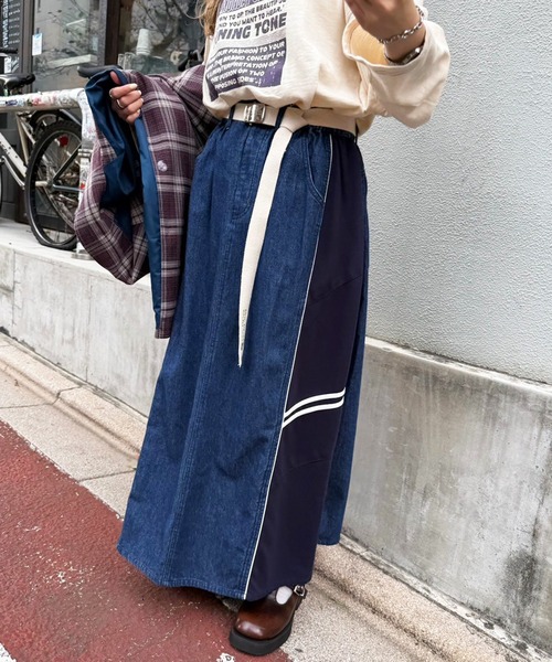 \主役スカート見つけたっ🎯/ジャージ×デニムの最強ドッキング!スポ×レトロが可愛すぎるフレアSKが登場💥両サイドのジャージライン&パイピングでインパクト抜群!リメイク風デザインで360度どこから見てもオシャレ映え◎ ウエストはゴム+紐でストレスフリー🎵フロントだけベルト仕様だから、タックインしてもスッキリ見えが叶います✨ ▶INDIGOはネイビー×マスタードで王道カジュアル💙▶BLACKはエンジ系で古着っぽオシャレさんに推しカラー❤️ いつものコーデにスパイスをプラスしたいあなたにおすすめ🫶数量限定だからお早めにっ! ■キーワード古着MIXデニムスカートダブルネーム恐竜ミニレックス ■素材・透け感:無し・裏地:無し・光沢感:無し ※生地寄りの画像が実際の色味と近いものとなります。 ※ご覧のモニター環境や撮影環境により実際のカラーと異なる場合がございますので 画像をご参照の上、ご了承頂けますようお願い致します。