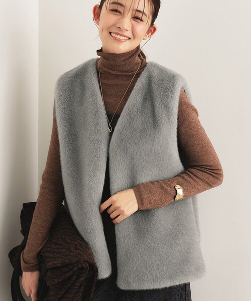 【デザインポイント】トレンドのミンク調の滑らかなタッチのファーが秋らしさをぐっと引き立てるシンプルなジレです。軽い着心地のプラスワンアイテム。裏地側にはポケット付きで機能性も兼ね備えています。インナーがニットになっても窮屈感のない袖繰りや、着ぶくれしにくい絶妙なサイジングにこだわっています。【スタイリングポイント】シアーインナーなどのシンプルトップスや柄ワンピースへのプラスワンで一気に秋のトレンドスタイルが完成します。ボリュームボトムとの相性も良く、ワイドパンツやレザー調のスカート合わせもおすすめです。【素材ポイント】上品な艶感とふわふわした柔らかな肌触りが特徴。ファーの毛先にだけプリントする事で、リアルファーのような表情に仕上げたお手入れしやすいデイリーユースに最適な素材になっております。【仕様】・ポケット数:内側×2・裏地あり※照明の関係により、実際よりも色味が違って見える場合があります。また、パソコン・スマートフォンなどの環境により、若干製品と画像のカラーが異なる場合もございます。モデル情報:身長167cm B80 W57 H83 着用サイズ:38(M)店舗へのお問い合わせ商品番号:127-44902●製品寸法:05(XXS):着丈60cm B90cm 肩幅35cm13(LL):着丈65cm B110cm 肩幅41cm15(3L):着丈65cm B114cm 肩幅41cm34(S):着丈62cm B92cm 肩幅35cm38(M):着丈63cm B98cm 肩幅37cm備考:重量:約470g(サンプルサイズ)