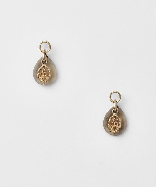 人気のカラーストーンシリーズから、愛らしいサイズ感のピアスチャームが登場。 石のフォルムは、雨のしずくをイメージした柔らかなシルエット。透かし模様には、雨粒が葉に滴る瞬間の美しさを閉じ込めました。 自然の情景を繊細に表現したデザインは、耳元に静かな詩情と透明感を添えてくれます。 小ぶりながらも印象的なチャームは、日常の装いにそっと寄り添い、季節の移ろいを感じさせるアクセントとしてもおすすめです。 ※天然石や天然素材を使用しているものは、サイズ・色味・風合いの違いや、若干の傷、内包物の有無などに個体差があります。予めご了承ください。 ※石が割れやすいデザインですのでお取り扱いはご注意ください。