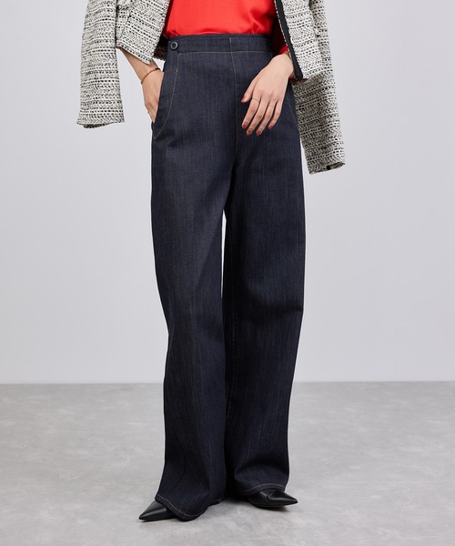 セーラーパンツのディテールをさりげなく効かせた、美脚見えデニム。腰まわりをすっきり見せる設計で、スタイルアップと大人のカジュアルが両立する1本【デザイン・シルエット】 セーラーパンツのディテールをそぎ落とし、よりコーディネートしやすいプレーンなデザインに。 腰回りはすっきりとしたサイズ感で、ヒップ位置が高く見える設計。スタイルアップを叶えてくれる美脚見えでデニムです。 【おすすめのスタイリング】 同時期に展開しているファーブルゾンや、軽い素材の羽織との合わせがおすすめです。 【素材】 デニムの老舗生地メーカー「KUROKI」の11.5ozストレッチデニムを使用。重すぎず、ストレッチ性もあるため快適な着心地です。 岡山のデニム工場で縫製し、岡山産の素材を使った“地産地消”のサステナブルなJAPANクオリティ商品です。 ---------------------------- 透け感:なし 裏地:なし 伸縮性:あり 光沢感:なし 生地の厚さ:中肉 ポケット:あり 開き方:ファスナー ---------------------------- 【モデル情報】 モデル身長:175cm 着用サイズ:38 ※画像の商品はサンプルです。実際の商品と仕様、加工、サイズが異なる場合がございます。 ※撮影場所やライティング、お使いのモニター環境によって色の見え方が異なる場合がございます。 ※商品のカラーは画像の色味をご参照ください。動画は仕様説明のため、色味が実物と異なる場合がございます。