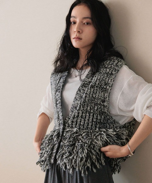 ■素材■ エアリーなふわふわした糸を生かしてループ状のフリンジに編み上げました。 ■デザイン■ ボリューム感のあるローゲージのループ網を施すことでキャッチ―なニットベストに仕上げました。 ゆったりとしたサイズ感で抜け感を演出してます。 ■スタイリング■ インナーと合わせてお召しいただくと冬から春先までシーズンをまたいで活躍できるアイテムです。