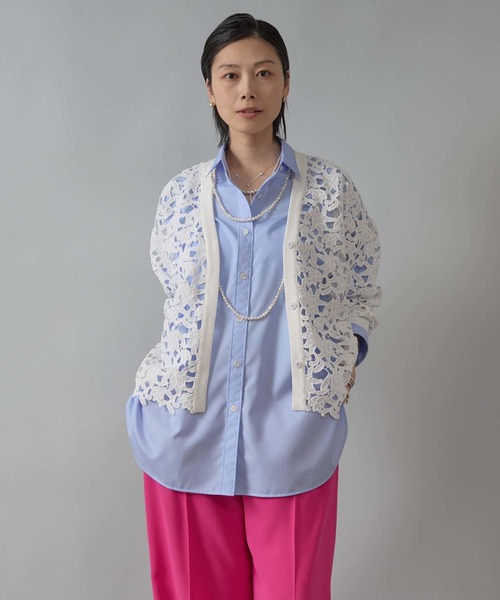 一見ヴィンテージの羽織の様に見えるニットカーディガン。 暑い時期はタンクトップに重ねて、秋にはシャツに重ねてレイヤードスタイルを楽しめるアイテムとしてオススメです。 少し着丈が短く様々なアイテムとの相性が良いです。 裾が断ち切りなので全体的に軽やかに仕上げられています。 大柄のレースデザインが甘すぎず大人の女性に寄り添えスタイリングのポイントになります。 今季らしくデニムなどのカジュアルMIXコーデにも取り入れていただけます。 端境期の羽織りとしても活躍間違いなしのおすすめアイテムです。 特別感のある大柄のケミカルレースを使用しています。 前立て、リブ部分、後見頃をニットで編みたてスッキリと仕上げています。 刺繍糸にマットなポリエステルを使用し、ドレッシーなイメージをデイリーにも使用できるようなレースに仕上げました。 手洗い可能です。 ※サンプル撮影のため実際の仕様と異なる場合がございます。 予めご了承ください。 ■透け感 あり ■伸縮性 あり ■光沢感 なし ■裏地 なし ■生地の厚さ 普通