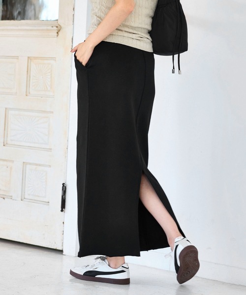 女性らしいシルエットにこだわった裏毛素材のスカート。◆2025秋冬◆ <POINT> ・裏毛でリラックス感がありながらも女性らしいシルエット。 ・裾は断ち切りの仕様で抜け感を演出しています。 ・ウエストはゴムなので、リラックスして着用で着ます。 ・季節の変わり目から真冬までレイヤード次第で長く使えるアイテム。 【デザイン・シルエット】 カジュアルな素材ながらもナローシルエットにすることで女性らしく仕上げたスカート。 着心地も柔らかく長時間履いてもストレスフリーで、デイリーに使いやすいアイテムです。 【素材】 目の詰まった裏毛で柔らかい履き心地ながらも、カジュアルな印象になり過ぎない素材です。 【カラー】 デイリーに使いやすいブラックと杢グレーの2色展開。 【おすすめのスタイリング】 ジャケットやシャツなどマニッシュなアイテムとスタイリングしていただくのがおすすめです。 パンプスやブーツでキレイめにも着回し出来ます。 ----------------------------- 裏地:なし 光沢感:なし 透け感:なし 伸縮性:ややあり ウエスト:ゴム、ひもあり ファスナー:後ろにあり ポケット:なし ボタン:なし 生地の厚さ:普通 その他仕様:ウエストの紐はドロストコードの使用です。後ろの真ん中にスリットあり。 季節:春、秋 ----------------------------- ※画像の商品はサンプルです。実際の商品と仕様、加工、サイズが若干異なる場合がございます。 ※画像によっては実際の色味と異なる場合があります。正しい色味は生地アップ画像をご確認ください。