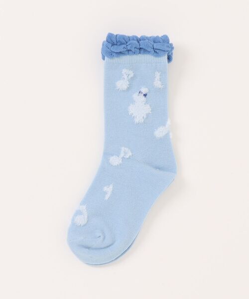 音符とmimiちゃんのシルエットの柄のソックスです。柄は、表面感ある糸で編み込まれ、浮かび上がっています。くしゅくしゅした履き口も、足元のアクセントに。