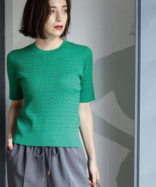 紫外線が気になる時期に嬉しい!UVケア機能付きのケーブル編みニット 【デザイン】 ・コンパクトでありながら身体に張り付きすぎない、程よくゆとりのあるシルエット。 ・トレンド感がある、きれいめに着られる細めのケーブル編み。 ・すっきりとしたクルーネックで洗練された印象に。 ・一枚着としてはもちろん、ジャケットなどのインナーとしても長く着られるハーフスリーブ。 ・同素材のニットカーディガン(637-34002)もお作りしております。 【素材】 ・さらりとした肌触りで、きれいめに着られるレーヨン混素材を使用。 ・ハイゲージの糸を使用して編み立てており、きれいな目面がポイント。 ・マシンウォッシャブルでご自宅でのお洗濯も可能。 ・紫外線が気になる時期に嬉しいUVケア機能付き。 ※この製品は、太陽光線中の紫外線(UV)を通しにくくします。この効果は永久的ではありません。 ※照明の関係により、実際よりも色味が違って見える場合があります。また、パソコン・スマートフォンなどの環境により、若干製品と画像のカラーが異なる場合もございます。 モデル情報:身長163cm B82 W62 H91 着用サイズ:38(M) 店舗へのお問い合わせ商品番号:637-14006 ●製品寸法: 36(S):着丈53cm B82cm 袖丈26cm 肩幅31cm 38(M):着丈55cm B86cm 袖丈27cm 肩幅33cm 40(L):着丈57cm B90cm 袖丈28cm 肩幅35cm 42(LL):着丈59cm B94cm 袖丈29cm 肩幅37cm 備考: