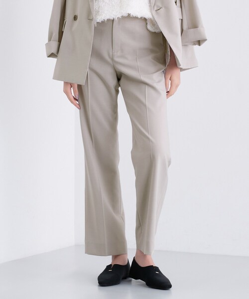 【デザインポイント】 ミドルヒップからラインを拾いすぎず、まっすぐ落ちる細身のストレートラインパンツです。 お腹周りはすっきりさせ、スーツセットアップとしてもすっきり着用できます。 センタープレスで足をまっすぐ立体的に見せてくれます。 【スタイリングポイント】 ワイドとスキニーの間のシルエットでボリュームトップスや長丈アイテム、ジャケットスタイルでもすっきりと合わせていただけます。 同素材ジャケットとのセットアップも可能です。 【セットアップアイテム】 ダブルジャケット:127-44903 【素材ポイント】 この素材は、梳毛ウール調のすっきりとした表情に、程よいハリ感と軽さを併せ持ったエアリーで清涼感のある着心地とシワになりにくいイージーケア性/UVケア性も兼ね備えた素材になっております。 【仕様】 ・ポケット数:横×2 後ろ×2 ・前ファスナー ・ウエスト後ろゴム ・裏地あり ※この製品は、太陽光線中の紫外線(UV)を通しにくくします。この効果は永久的ではありません。 ※照明の関係により、実際よりも色味が違って見える場合があります。また、パソコン・スマートフォンなどの環境により、若干製品と画像のカラーが異なる場合もございます。 モデル情報:身長167cm B80 W57 H83 着用サイズ:38(M) 店舗へのお問い合わせ商品番号:127-64903 ●製品寸法: 03(XXXS):W59cm H87cm 股下65cm 前股上24cm 渡り幅29cm 裾幅21cm 05(XXS):W62cm H90cm 股下66cm 前股上25cm 渡り幅30cm 裾幅22cm 13(LL):W80cm H107cm 股下76cm 前股上28cm 渡り幅36cm 裾幅25cm 15(3L):W84cm H111cm 股下76cm 前股上28cm 渡り幅37cm 裾幅26cm 19(5L):W92cm H119cm 股下76cm 前股上30cm 渡り幅40cm 裾幅26cm 36(S):W67cm H94cm 股下72cm 前股上25cm 渡り幅31cm 裾幅22cm 38(M):W70cm H97cm 股下73cm 前股上26cm 渡り幅32cm 裾幅23cm 40(L):W73cm H100cm 股下75cm 前股上26cm 渡り幅33cm 裾幅23cm 備考: