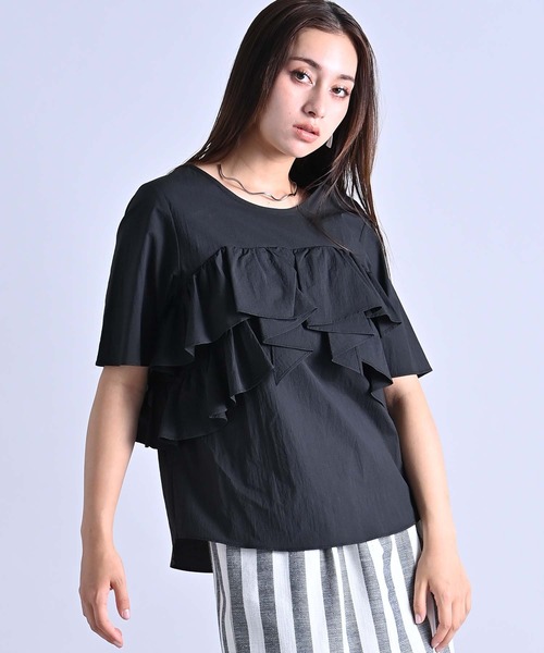 フェミニンモードなフリルブラウス【デザイン&ディテールポイント】まるでフリルビスチェをレイヤードしたかのようなディティールが、甘さとシャープさを共存させるデザイン。素材は軽く柔らかなハリ感のある綿ナイロンのワッシャー加工生地を使用。ボディラインを拾わない程よいボリュームと、計算された切り替えが立体感を生み、どこかモードな佇まいに。後の共ヒモの結び方でシルエット変化も楽しめ、一枚で着映える主役ブラウスは、ワードローブに加えたいアイテム。【スタイリングポイント】ボリュームボトムにもフィットする丈感なので、タックインせずアウトでさらりと着るのが今の気分。■使用上の注意濃色の物は汗や雨でぬれた時、又は強い摩擦により色移りすることがあります。濡れた状態での放置、重ね置きをしないでください。軽く押し洗いをして下さい。あて布使用。===========================厚み:普通伸縮性:ややあり裏地:なし透け感:ややあり生地感:普通洗濯:手洗い可===========================【RAWFUDGE/ローファッジ】30代の女性が着たいリアル服を作りたいそんな思いから女性が中心となり立ち上げたブランドです。【Mode】【Standard】【Luxe】をキーワードに大人女性に向けシンプルの中に遊び心のあるシャツ・ブラウスを中心に心地良さとオシャレを両立させる、ありそうでない進化系リアルクローズを提案します。
