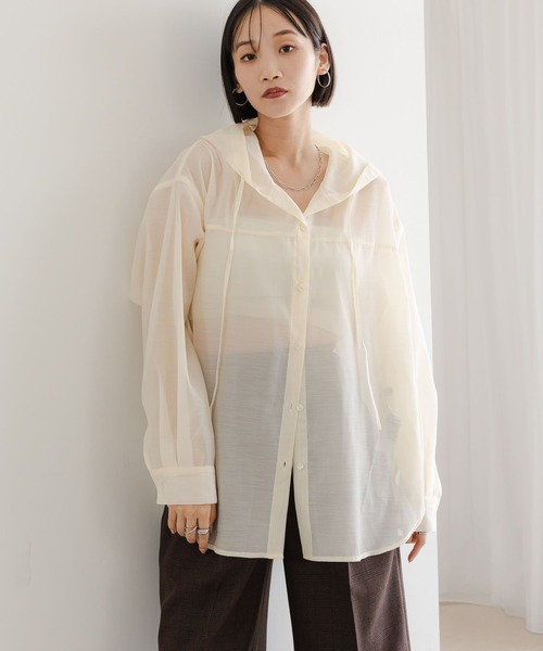 ■素材■ アダストリア独自で開発した糸を使用したシアー素材です。 適度なハリ感と透け感で通気性も良く、快適に着こなせます。 ■デザイン■ 人気のシアーシャツ素材を使用したシアーフードシャツになっています。 シンプルなデザインなので、上からの羽織でももちろん、 季節が進めばスウェットの下などに着込んでいただくと トレンド感のあるスタイリングが可能です。 ■スタイリング■ 暑い季節にはキャミソールなどの上から羽織っていただけると 涼しげに着用いただけます。 秋口にかけてはスウェット合わせなどがおすすめです。 .