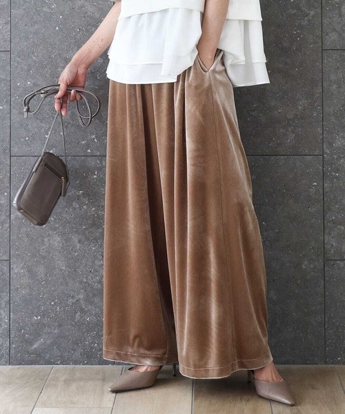 シンプルコーデに映えるベロア素材のワイドパンツ ■デザイン トレンド感のあるベロア素材で仕立てたワイドパンツ。生地に落ち感があるため、裾に向かって流れるドレープが印象的。伸び感もありストレスフリーな履き心地。 ■素材 光沢感となめらかな肌触りのベロア素材を使用。落ち感のある素材でやわらか、伸縮性もあります。ご自宅で手洗い可能な扱いやすさも嬉しい。 ■コーディネート 表情のあるベロアは存在感がある分、シルエットは使い勝手やすいデザインに。手持ちのアイテムと馴染みやすくコーディネートを選びません。カットソーやニットなど、あえてカジュアルなアイテムと合わせてラフに着こなすと大人っぽい印象に。 -------------------- 着用シーズン 春:○ 夏:× 秋:◎ 冬:◎#秋服 -------------------- 洗濯表示:手洗い可 透け感:なし 裏地:なし 伸縮性:あり ウエスト:ゴム仕様 生地の厚さ:ふつう -------------------- ※自然光・照明の関係、パソコン・スマートフォンなどの環境により、実際と色味が違って見える場合がございます。予めご了承ください。商品の色味は、詳細画像をご参照ください。 ※サンプルでの撮影となるため、実際にお届けする商品と仕様やサイズが異なる場合がございます。