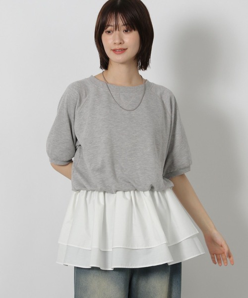 裾に布帛がデザインされ、簡単にレイヤードスタイルを楽しめる万能トップス。 裏毛部分がコンパクトなのでバランス良く異素材MIXのスタイリングを楽しめる1枚です。 【素材】 ボディには薄手のミニ裏毛素材、裾には布帛素材を使用。 【スタイリング】 デニムなどのカジュアルパンツとの相性〇 ボリュームのあるシルエットなので細身のナロースカートとのスタイリングもおすすめです。