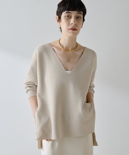 【2025AW】シャープな印象をプラスする、シンプル深Vネックニット■深めのVネックがポイントのニットプルオーバー。■シャープなネックラインがすっきりとした印象で、着痩せ効果も期待できるデザイン。■程よいゆとりがありつつ袖口に向けて細くなるスリーブシルエットで、袖捲りしやすいのもポイント。■両サイドのスリットが抜け感をプラスし、フロントをボトムにインする着こなしも◎。■メイントップスとして一枚で楽しんだり、Tシャツやシャツを中に重ねたレイヤードスタイルもおすすめ。【COLOR】ベージュ:女性らしい柔らかさのあるナチュラルなベージュ。ブラック:すっきりとスマートに着こなせるブラック。【MATERIAL】柔らかくさらりとした肌触りのコットンポリエステル素材。【STAFF COMMENT】■身長156cm|普段サイズ M~L|着用サイズ F深めのVが抜け感を出すニット。夏に人気だったノースリーブの長袖バージョン。程よいハリがあり、シルエットを楽しむアイテムです。裾はボトムよってイン、アウトをお楽しみください。■身長165cm|普段サイズ S~M|着用サイズ F毛羽立ちのないすっきりとしたVネックニットは、デコルテがきれいに見える深V開きがフェミニンなアイテム。オフィスコーデからカジュアルコーデまで、汎用性が高くて便利!----------------------------------------------------洗濯方法:手洗い可透け感:なし裏地:なし伸縮性:あり光沢感:なし----------------------------------------------------【注意事項】・画像の商品はサンプルです。実際の商品と仕様、加工が若干異なる場合があります。また 、パソコンやスマートフォンのモニター環境などにより、色味が違って見える場合があります。・店頭及び屋外での撮影画像は、光の当たり具合で色味が違って見える場合があります。商品の色味は、スタジオ撮影の画像をご参照ください。・入荷状況により、お届け予定が前後する場合があります。・お客様への発送が店頭販売より遅れる場合があります。・追加生産商品は、一部の店舗、通販で販売中の場合があります。予めご了承下さい。【気になるアイテムは、「お気に入り」登録を】ハートマークをクリックしておくことで、スムーズにお買い物が楽しめます。・ラスト一点のお知らせ・再入荷のお知らせ・SALEのご案内