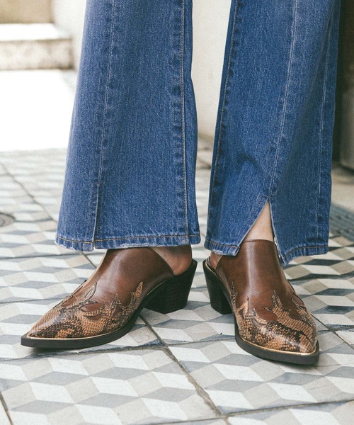 さっと履くだけで、大人の抜け感を演出 トレンドのウエスタン要素を取り入れた、シーズンムードが高まるミュール。 【デザイン】 足元をきれいに見せてくれるポインテッドトゥに、切り替えのカッティングを入れました。 本スタックヒールを使用し、本格的な印象をプラス。 底面のシルバー&ゴールドのラインが、さりげなくエッジを効かせています。 【機能】 太めのヒールは程よい高さで安定感があり、シャープな見た目ながらも歩きやすいです。 足を差し込むだけで履ける手軽さと、甲を深めに覆うアッパーで脱げにくいのもうれしいポイント。 製品の一部に消臭・抗菌効果のあるデオドラントテープを使用しています。 【おすすめスタイリング】 カジュアルからモードまで幅広いスタイリングに合わせやすく、履くだけで大人の着こなしが完成します。 フルレングスのボトムスからチラっと覗くだけでもアクセントになり、シンプルコーデにもおすすめ。 季節の変わり目にブーツは重たくなる足元も、ミュールだと軽く取り入れていただけます。 ※屋外の光や照明の当たり具合で、実際の商品の色味とカラー別画像の色味に違いが発生する場合がございます。商品の色味はスタジオ撮影の詳細画像にてご確認ください。 ※商品の色や質感を出来るだけ忠実に再現するよう心掛けていますが、実物と若干異なる場合がございます。 ※サンプルにて撮影をしておりますので、実際の商品とは仕様や加工・サイズ等が若干異なる場合がございます。 ※写真を許可無くコピー・転用することは固くお断りします。