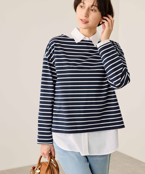 リラックス感のあるボックスシルエットのボーダーカットソー。【素材感】・コットンのように快適でありながら、シワや型崩れを気にせず洗える。・ほど良いハリ感ある素材。【デザイン・シルエット】・体のラインを拾わない、直線的でゆったりとした箱型のシルエットが特徴のボーダーカットソー。・首元は横に広く開いたボートネックで、顔周りをすっきりと見せ、カジュアルなボーダー柄に上品さと女性らしさをプラス。・デコルテラインをきれいに見せる効果も。・肩のラインが落ちたドロップショルダーのデザインが、より一層リラックスしたムードと抜け感を演出。・長すぎず短すぎない着丈で、タックインしてもアウトで着てもバランスが取りやすく、様々なボトムスに合わせやすい設計。【カラー】・ブラック系、ブラウン系、ネイビー系の3色展開。【スタイリングポイント】・中にシャツやブラウスを重ねると、襟元から色や素材が覗ききちんと感も加わりカジュアルすぎない着こなしに。・スラックスやIラインスカート、ロングスカートなど綺麗めボトムと合わせて、洗練された大人のカジュアルスタイルに。・華奢なネックレスやメガネ、レザー調のバッグやシューズを合わせると、ラフになりがちなボーダースタイルも、ぐっと引き締まるのでおすすめ。-----------------------------裏地:なし光沢感:なし透け感:ネイビー(41)なし、他はややあり伸縮性:ややありポケット:なしボタン:なし生地の厚さ:やや薄手季節:春、秋、冬(カーディガンやジャケットのインナーに◎)-----------------------------※撮影時の光、お使いのモニター環境によって色の見え方が違う場合がございます。【モデル着用サイズ】身長:165cm 着用サイズ:F
