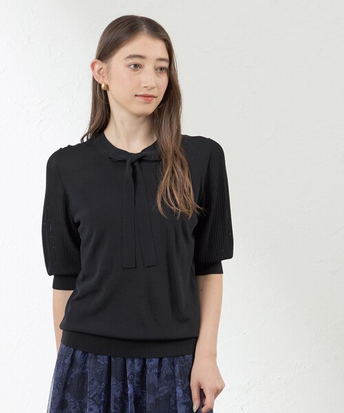 一枚で着映えするボウタイ付きニット 【デザイン】 身頃は天竺で袖がレース柄のボウタイのプルオーバーです。 リボン結びも可能なので、シーンに合わせて着用いただけるデザインです。 スカート合わせのコンパクトなシルエットです。 チュールスカート(V5S01-668)とのコーディネートもおすすめです。 カラー展開は、ベーシックカラーのブラックネイビーと穏やかで大人っぽい印象のマスタードの2色展開です。 【素材】 高級感のある光沢と落ち感を併せ持った滑らかで風合いの良いストレッチ素材です。 身頃のみ接触冷感がついております。 手洗い可能でお手入れしていただきやすいです。
