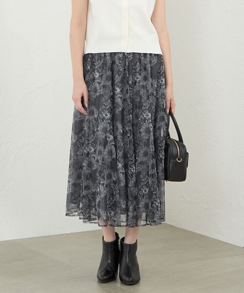 繊細に表現されたリバティチュールプリントスカート【デザイン】リバティプリントをポリエステルチュールにプリントしました。ウエストのギャザー分量で太って見えないよう、裾にいくつもフレア切り替えを入れてウエストはスッキリ、裾にはボリュームを出したデザインです。ウエストはサテンのゴムベルトになっているのでストレスフリーで着ていただけます。カラーもややダークに仕上げているので秋を先取りできるアイテムです。キレイ目なカットソー(V5P36586)や、バルキーレーヨンボウタイニット(V5N31595)とのコーディネートもおすすめです。カラー展開はシックなブラックと柔らかい印象のネイビーの2色展開です。【素材】2009年シティポプリン用にリバティ社のデザインスタジオで作成された「ダンクレア」を元に、2012年春夏にスウィムコレクションで「スイム・ダンクレア」としてリドローされた一柄を元にしています。今回はその「スイム・ダンクレア」を縮小し使いやすくしました。向日葵、ゼニアオイ、アンゼリカ、ヒナギク、シャクヤク、紫陽花等が力強く描かれたデザインです。・転写プリントという技法でプリントした素材です。リサイクルポリエステルチュールを使用し、水を使わないプリントなので、環境に優しいのがポイントです。手洗い可能でお手入れしていただきやすいです。