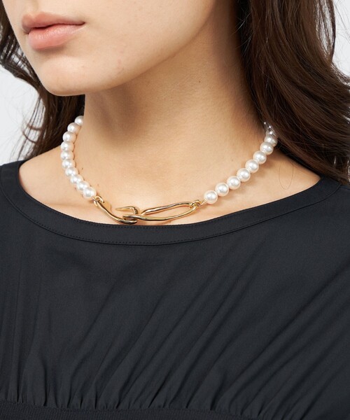 【素材・デザイン】 オイスターメタルクロージャーが目を引く、存在感あるチョーカーネックレスです。スワロフスキーガラスパールとゴールドのオイスターメタルパーツを組み合わせた、上質なコントラストが首元を華やかに彩ります。 ※この商品はサンプルでの撮影を行っています。 実際の商品とイメージ、仕様が異なる場合がございます。
