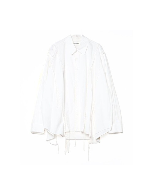 通常のブロードよりも少し肉厚に仕上げた、縦糸と横糸の異なった番手を組み合わせた透け感のないブロードを使用したドッキングオーバーワイドシャツ。シームにランダムかつ計算的に施したルーピング加工がアクセントとなったアイテム。