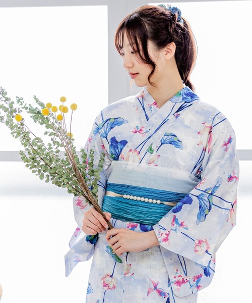 浴衣と帯がセットになったコーディネート済みレディース浴衣セットです。 京都きもの町オリジナル浴衣ブランド「Clarus」 Clarus(クラルス)は、「清らか」「明るい」という意味をもつ言葉からインスパイアされたブランドです。 花や風景などの自然をモチーフにし、明るく華やかな柄やカラフルな色使いと、自然の美しさを感じさせるデザインが特徴です。 纏う人の魅力を引き立てる、明るく清らかな透明感を表現します。 ◆夏の思い出◆ 「夏の思い出」それは、花火や夏祭り、海や夏の花など、誰もが目にしたことのある夏の風物詩や日本の伝統的な風景。みずみずしい草花の姿や、花火の儚くも忘れられない一瞬の美、幻想的な金魚などが、夏らしい鮮やかなブルーと、ノスタルジックなセピア系の2色で表現されています。 夏祭りや花火大会、海水浴など、さまざまな夏のシーンで活躍しそう。楽しい季節をより鮮やかに彩り、特別な思い出として心に残る、そんな浴衣を目指しました。 ◆「Made in Japan」のプリント、技術◆ 浴衣生地が染められたのは、1966年から続く日本有数の染色工場。創業以来、「Made in Japan」の物作りへの前向きな姿勢と強いこだわりをもって、商品開発・加工技術の向上に努めてこられた工場です。 Clarus(クラルス)の浴衣生地は、シルクスクリーンというメッシュ状の製版に染料を染み込ませてプリントを行う手法で染められています。色味をはっきりと、彩度を高く表現できる一方で、1つの図案・プリント生地の中で使える色数が制限されるため、手描きタッチの色のゆらぎを美しく表現するには、技術が必要な手法です。 それを踏まえ、社内で製版を行うことで確立されたプリント技術。それが最大限発揮された色彩の豊かさ、柄に奥行きや臨場感が感じられるような表現力が持ち味です。 海外プリントではなかなか難しい繊細な色彩表現。Clarus(クラルス)の浴衣の透明感のある仕上がりは「Made in Japan」を大事にした企業風土だからこそ実現した美しさです。 【商品内容】浴衣、帯の計2点セット ※下駄・帯飾り・髪飾り・バッグなどの小物は付属しておりません。 ※帯は作り帯ではありません。ご自身で結んでいただく帯となります。 【色柄】 1.雨上がりのあじさい 空色(ホワイト×パープル)※【衣装協力】「潮紗理菜のサリマカシーラジオ」の公開収録イベントにて、児玉遥様に浴衣をご着用いただきました★浴衣:白に淡い花群青色の地。白や紺色、にじんだセルリアンブルーで表現されたアジサイの花。淡いベージュの影に挿し色としての赤紫色やピンク色がみずみずしく鮮やかな印象です。 帯:ややグレイッシュな白から、灰みの淡い青藤色、深い青紫がかった紺のグラデーション。 2.目覚めのあさがお 薄青(ライトブルー) 浴衣:ラフに色付けしたような淡いブルーと白の地。淡くにじんだ水彩調の朝顔は、深い紺に藍色ぼかしの花、中央に淡いピンクがポイント。黄緑に深い緑の葉。夏の朝の空気のように爽やかなデザインです。 帯:緑がかった鮮やかな青から、ウォーターグリーン、明るい黄緑のグラデーション。 3.星降り花火 紺青(インディゴブルー) 浴衣:淡い群青色に濃淡のあるネイビーの流れ。白やネイビー、水色の線で表現された花火。夏の夜に次々に打ちあがる花火のスターマインのような鮮烈な雰囲気の浴衣です。 帯:わずかに青みの白から、グレイッシュな淡い水色、グレイッシュな明るいブルーのグラデーション。 4.水中花と夢金魚(スカイブルー) 浴衣:白地にごく淡い紫みの青のぼかし。水彩調の蓮は、深い紺に藍色、黄緑の挿し色の入った葉、その間から長く伸びた茎の先にやわらかな赤紫に色づいた花、ベージュの影。夏の夢のような世界をふわふわと浮かび泳ぐ金魚たち。 帯:緑がかった鮮やかな青から、ウォーターグリーン、明るい黄緑のグラデーション。 【サイズ】 浴衣:身丈約165cm / 袖丈約49cm / 裄約68cm / 前巾約25cm / 後巾約30cm 帯:長さ:約4m / 幅:約45cm 適応身長:約156~165cm(ヒップ94cmくらいまで) 【着用シーン・季節】夏祭り・フェス・花火大会・浴衣デートなど、夏のイベント・お出かけに。おうちでの夕涼みに。