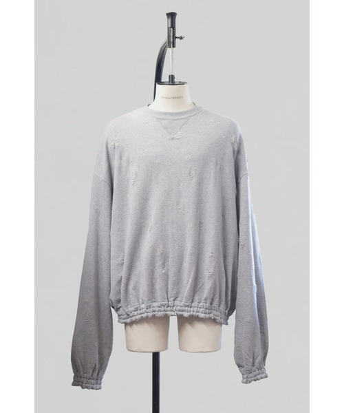 誰とは特定しない、それぞれが思う「彼」から借りたフィット感のスーパーオーバーサイズのプルオーバースウェット。袖口と裾に3本ゴムを強めに入れているので、ウエスト位置に留めてショート丈としても、そのままロング丈のままでも着て頂けます。生地はタオルのように編みこんだ生地にダメージ加工を施した裏毛。