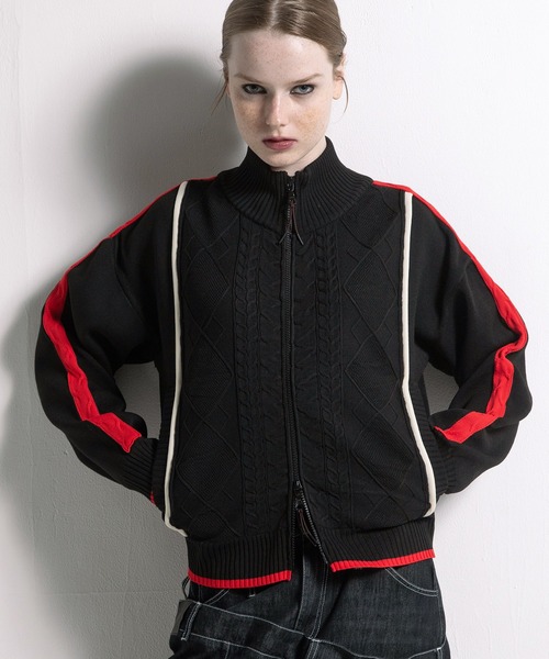 ニットだけどジャージー見えするデザインがポイント。 マットで細いポリエステルのストレッチ糸を使用して、 スポーティーな雰囲気に仕上げている。 前身頃は、ケーブルとアーガイルのニットらしい編地と、 ゴム編みで伸縮性がある綺麗めな編地を使い異素材感を出した。 袖山の配色ラインはケーブル柄で、身頃はカールさせたパイピングがアクセント。 ダブルジップなので裾を開けての着用も動き易く嬉しいポイント。 スライダーに下げた、丸ゴムも拘りディテール。 ※生産の都合上、商品の納期が変更となる場合がございます。 ※商品の画像はサンプルのため、実際の製品とは仕様や加工、サイズ等が若干異なる場合がございます。