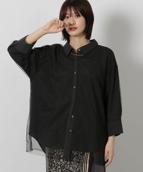 チュール素材がレイヤードされたシャツトップス。シンプルなデザインながらもチュールがアクセントになりスタイリングの主役になる1枚です。身幅にゆとりがあり、ドロップショルダーなので窮屈さなく着用いただけるシルエットも〇前開きでもスタイリングできるので幅広い着こなしが楽しめるアイテムです。【素材】ハリのあるチュール素材に、ボディのシャツはさらっとした肌触りのポリエステル素材。【スタイリング】カジュアルにもキレイ目にも合わせやすいアイテムです。着こなしの幅も広がるのでワードローブにもおすすめ。(ボルドーとブルーはストライプ柄です)