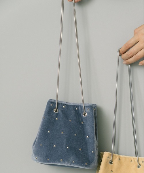 ベロア素材が上品な印象の巾着バッグ。 スタッズをあしらったデザインで、オンオフ問わずにお使いいただけます。 内側にはポケット付きで、小物の整理もしやすくなっています。 スタイリングが華やかになるアイテムです。