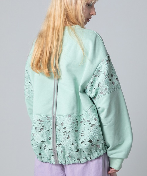 微光沢のナイロンに、大柄のケミカルレース重ねた異素材コンビのトップス。同色系ながらも異素材の組み合わせで、立体感と奥行きのある表情に。グリーン配色は、グレーナイロン×グリーンレースがさりげなく映えるカラー設計。身頃はしっかりとした度詰め裏毛でカジュアルさをプラス。前身頃、後身頃には異素材のパイピング切り替えを入れ全体を引き締めるアクセントに。裾は後ろ下がりで、ぐるりとゴム仕様にし、丸みのあるシルエットと着やすさを両立。※生産の都合上、商品の納期が変更となる場合がございます。※商品の画像はサンプルのため、実際の製品とは仕様や加工、サイズ等が若干異なる場合がございます。