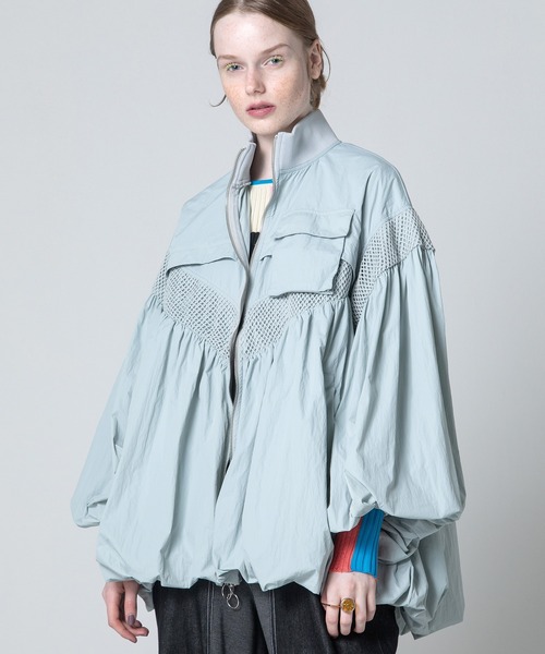 エアリーなナイロンタフタ素材に、たっぷりのギャザーを寄せて作ったバルーンシルエットが目を惹くブルゾン。軽く華やかなデザインで、切り替え部分にはナチュラルな風合いのメッシュ素材を使用し、シャープさもプラス。裾のゴムドロストコードを絞ると、お好みでギャザー分量を調節することが可能。ハリがありながら柔らかい素材を使用しているので、冬アウターの中にすぐ着て重ね着を楽しめたり、春の羽織としてメインで着ても使える、ロングシーズン着られるアイテム。裾のバルーン部分のみトリコット裏地付き。※生産の都合上、商品の納期が変更となる場合がございます。※商品の画像はサンプルのため、実際の製品とは仕様や加工、サイズ等が若干異なる場合がございます。