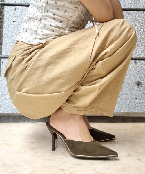 サッと履けるのが魅力のミュールパンプス。シャープなポンテッドトゥのシルエットにソール部分にぐるりと配したゴールドのパイピングがモード感をプラス! スエード調の素材でワントーンでまとめて落ち着いたムードに。 長めのポインテッドトゥなので、膝下を長く見せてくれる美脚効果も発揮。 気軽に履けて飽きずにサクッと合わせられるので幅広いスタイリングにマッチします!
