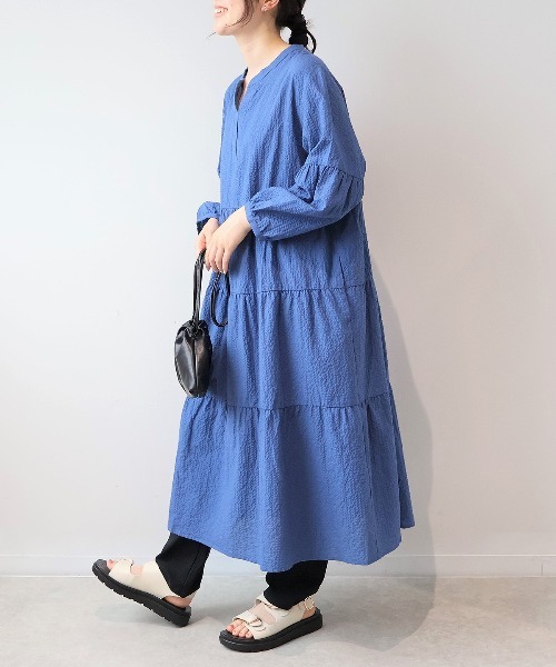 ボリュームを抑えたティアードが大人可愛いサッカーワンピース 【デザイン】 柔らかな凹凸感が心地よいサッカー素材を使用した、軽やかな着心地のワンピース。 フェミニンなティアードデザインながら、ギャザー分量を控えめにすることで広がりすぎずすっきり見えに仕上げました。 ドロップショルダーと9分袖のゆったりとした設計で、肩まわりにもゆとりがありノンストレスの着心地です。 体型カバーも叶えつつ、1枚で主役になるデザインです。 【素材】 やわらかく通気性に優れた綿混のサッカー素材を使用。 細かな凹凸が肌にまとわりにくく、さらりとした着心地が特徴です。 ストレッチ性・裏地はありませんが、ふんわりと軽やかで動きやすい一枚。 透け感もなく、インナーに悩まず着用できます。 ーーーーーーーーーーーーーーーーー 透け感:なし 伸縮性:なし 裏地:なし ーーーーーーーーーーーーーーーーー 【色展開】 2色展開 ・クロギンガム(黒×白のギンガムチェック 格子柄 白黒 ギンガムチェック) ・ブルー(紺 ネイビー 藍色) 【スタイリング】 細身のパンツやレギンスと合わせれば、すっきりとしたシルエットに。 ティアードデザインが腰まわりを自然にカバーしてくれるので、体型を気にせず着られるのが嬉しいポイント。 カジュアルにもきれいめにも使える、季節の変わり目に重宝するおすすめアイテムです。 【ブランド説明】 -MB mint breeze エムビーミントブリーズー 楽してキレイが叶う高感度、好感度カジュアルをテーマに L、LL、3L、4L、5Lを扱う大きいサイズ専門のブランド。 ゆったり着たい、ぽっちゃりさん、プラスサイズ、グラマーさんに多く支持されています。 《お気に入り登録》でお得な情報がいっぱい ・「商品のお気に入り登録」で再入荷通知や、人気アイテムのラスト1点通知、セール通知等お得な情報を受け取ることができます。 ・「ブランドのお気に入り登録」でSHOPの新作アイテムや再入荷など、お得な情報を受け取ることができます!