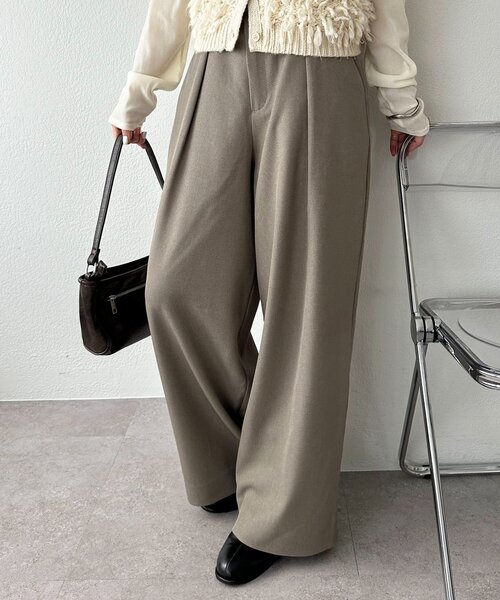 大人の抜け感ワイドパンツ ●デザイン 程よい落ち感とゆったりとしたシルエットが特徴のタックワイドパンツ。フロントに入った深めのタックが、立体的で美しいドレープを生み出し、腰まわりに自然なゆとりをもたらしてくれます◎シンプルながらも計算されたワイドシルエットは、動くたびに表情が生まれ、スタイリングに奥行きを与えてくれる仕上がりに。ウエストはすっきり見える仕様で、トップスインもアウトも様になる万能デザインです♪ ●素材 さらっとした表面感で季節を問わず着用しやすく、程よいストレッチ性があるため動きやすさも抜群。 シワになりにくく、デイリー使いはもちろん、通勤やお出かけにもぴったりの1本です。 *********************** 洗濯方法:手洗い 裏地:なし 透け感:なし 伸縮性:なし 光沢感:なし 生地の厚さ:普通 *********************** ●スタイリング オーバーシャツやスウェット、ベストなど、トップスを選ばず合わせやすい万能アイテム。 スニーカーでカジュアルダウンするのはもちろん、革靴やローファーでキレイめコーデにもマッチします♪ 【お取り扱いの注意】 ※着用時、洗濯時は必ず取り扱い表示・タグをご確認の上、お取り扱いください。 ・手洗い:40℃まで可能(短時間で軽く押し洗いをしてください。) ・濃色製品は白、淡色の製品と一緒に洗わないでください。 ・生成り、淡色の製品には、白っぽくなりますので蛍光増白剤入りの洗剤は使用しないでください。 ・タンブル乾燥:不可 ・アイロン:低温120℃まで(アイロンの際は、当て布をしてください。) ・クリーニング:可能 ・素材の特性上、着用時の摩擦で多少毛玉が発生することがあります。 【カラー表記について】 システム上の都合により、一部カラー名がサイト表記と異なる場合がございます。 【入荷時期について】 入荷日ごとに販売数量が決まっているため、オンラインでは完売後に次期納期の数量にて予約販売を行っております。 店舗入荷時期と予約商品のお届け時期が異なる場合がございますので、予めご了承ください。 ※追加入荷のある商品もございますので、詳しい店舗入荷時期に関しましてはお近くの店舗へお問い合わせください。 ※店舗の在庫状況に関しましては、こちらのページに記載されている「店舗在庫」から確認にしていただけます。 「在庫あり」の表記でも、お取り置き分などでお客様に販売できない場合がございます。 ※予約商品でも、店舗では追加がない場合もございます。ご了承ください。 ※初回予約商品でも配送処理が発生するため、店舗より遅れてのお届けとなる場合がございます。
