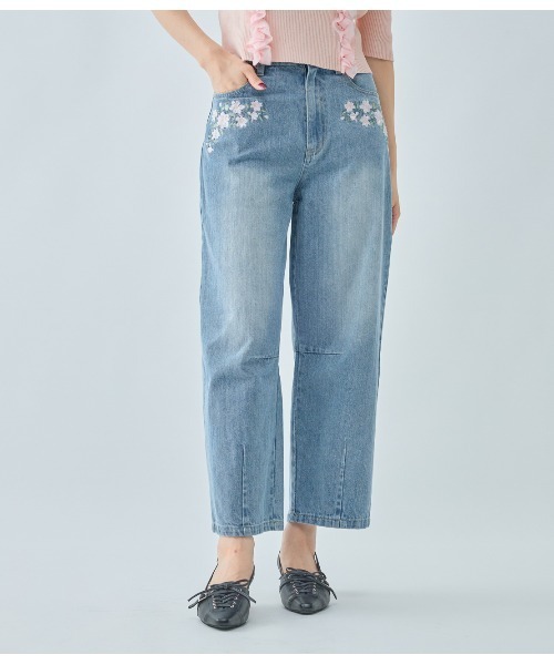 ゆったりなのに細見え、脚長効果も。今っぽ感で選ぶならバレルシルエット。【おすすめポイント】・ヒップ~太ももがふくらみ裾はすぼまる、旬のバレル(樽型)シルエット。・脚のラインをゆったりカバーしつつ、すっきり見えてスタイルアップ。・腰の両サイドのフラワー刺しゅうが、ガーリーなポイント。【こんな人、こんな時に】・腰まわり・脚をカバーしてスタイルアップしたい・デニムパンツを、少し甘いイメージで着こなしたい【デザイン】・ショート丈トップスとも相性のいい、ジャストウエストのはき込み・ヒップからひざ付近にかけてゆったりふくらみ、裾に向かってすぼまるシルエット。重たくなりすぎずすっきりした印象。ヒップ&脚のラインをカバーし、細見え効果あり・フロント左右にポケット、ヒップ左右にパッチポケット付き・フロントのポケット下に、フラワー刺しゅうのディテール。視線を引き上げ、脚長効果も・フロントの太もも部とヒップ付近に強めの色落ち加工を施し、こなれ感をプラス・足首が見えるくらいのやや短めのレングス【素材】・表面に少し凹凸感があるコットン100%のスラブデニム。やや薄手の10オンスでゴワつかず、ラクなはき心地モデルサイズ:165cm着用サイズ:Mサイズ※前ファスナー開き◎製品洗い加工の特性上、商品により色・風合い・仕上がりサイズが多少異なる場合があります。