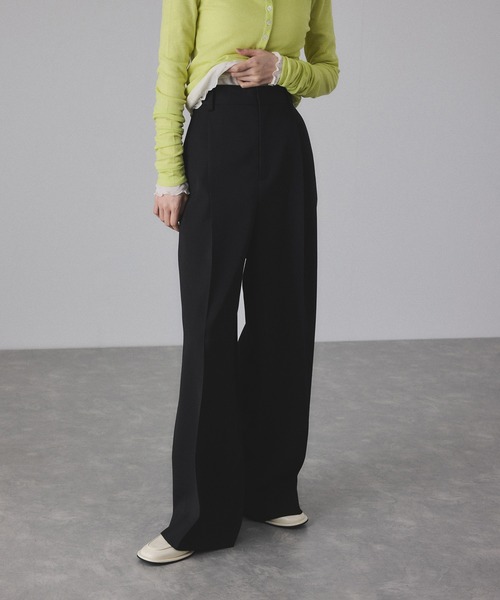 《セットアップ対応・オケージョン》ベーシックでありながら、シーンを選ばない程よいサイジングが魅力。普段使いはもちろん、仕事やセレモニーにも活躍するセミワイドスラックス◆2025-26秋冬◆ADAM ET ROPE' FEMME【Material】リサイクルポリエステルを含むウールミックス原料を梳毛引きすることで、毛羽の少ない綺麗な表面が特徴のギャバ素材。またウール糸に先染めTOP糸を使用することで、深みのある色も魅力的な素材。【Design】フロントにダーツからセンタープレスを施した、ウエスト周りがすっきりしたセミワイドシルエットスラックス。マーベルト仕様とAMFステッチ、直線的なシルエットが魅力。メンズライクな仕立てにシュっとした筒巾が美脚に見せてくれる一着。同素材のダブルブレストジャケットと合わせて、バックポケットのボタンはくるみボタンでポイントに。セットアップでも単品でも着回しの利くアイテム。◇同素材でダブルブレストジャケット(品番:GAV25020)もご用意しております。【Color】スタイリングに取り入れやすいブラックとチャコールに加え、今季らしいブラウンの3色展開。【Styling Point】ベーシックなセットアップ合わせもおすすめ。太すぎない筒巾のため、オーバートップスやミドル丈トップスを合わせてもバランスの取りやすい一着。---------------透け感:なし裏地:なし伸縮性:なし光沢感:微光沢生地の厚さ:中肉開き方:前ボタンファスナーポケット:あり---------------◇モデル情報身長:165cm size:38(ボブヘア)身長:169cm size:38(ロングヘア)