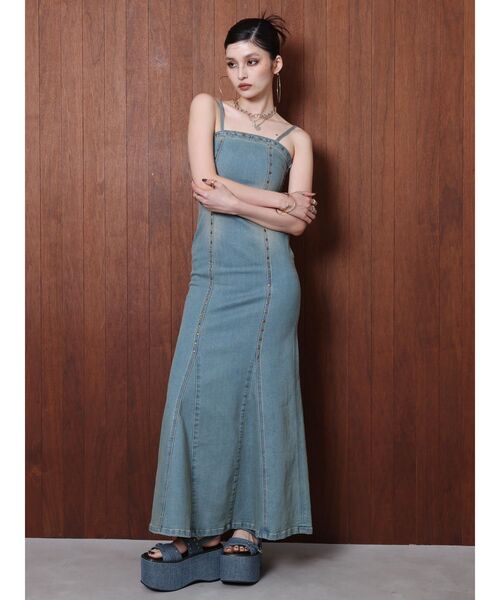 ★DENIM COLLECTION★デニムコレクション限定デザインのスタッズがポイントのフレアシルエットのロングワンピースです。伸縮性のある生地を使用しており、ストレスフリーに着用できます。ウエスト部分に色落ち加工を施しているためメリハリが出てスタイルアップ効果も抜群です。フレアシルエットにより、さらに華奢見えする1枚です。
