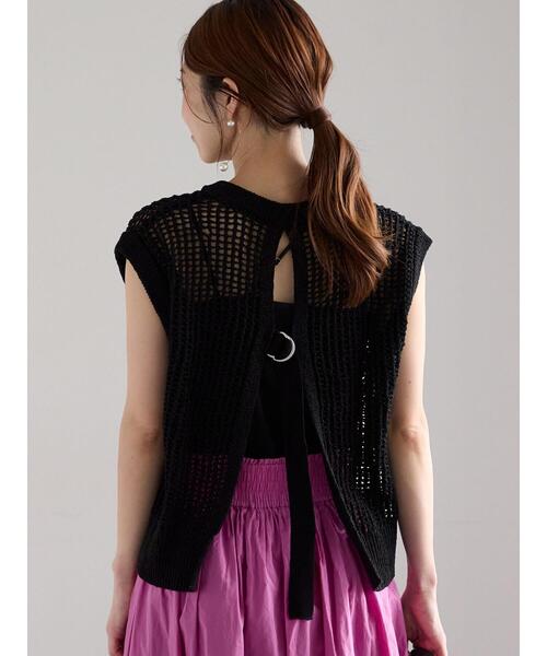 繊細ななテープヤーンをメッシュ編みし、軽やかな印象に仕上げたベスト。ベルトをあしらったバックスリットのディテールがポイント。スタイリングに抜け感をプラスしてくれます。レイヤードコーデも映えるデザインで、着こなしもおしゃれに決まるアイテムです。※商品画像は、撮影環境やお客様のご利用のPC・スマートフォンのモニター環境などにより実物と色味に差異がある場合がございます。