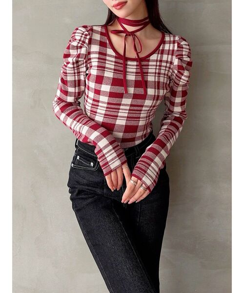 毎シーズン人気のチョーカーニットが登場!▽デザイン▽目を惹く大判のチェック柄がシーズンムードを高めます。パワショルデザインが女性らしさをプラス。チョーカー付きなので前後お好きな雰囲気で結ぶことができ、スタイリングのアクセントになります。チョーカーは取り外しもできるのでシンプルなニットとしても使え、様々なコーデにピッタリの着回し抜群な1枚です。▽カラー▽ベーシックで使いやすい無地の黒と、チェック柄のピンク・ミックスの3色展開。▽スタイリング▽インしやすい丈感なのでスカートからデニムまで様々なアイテムと好相性。セットアップのジャケットのインナーとしても重宝します。