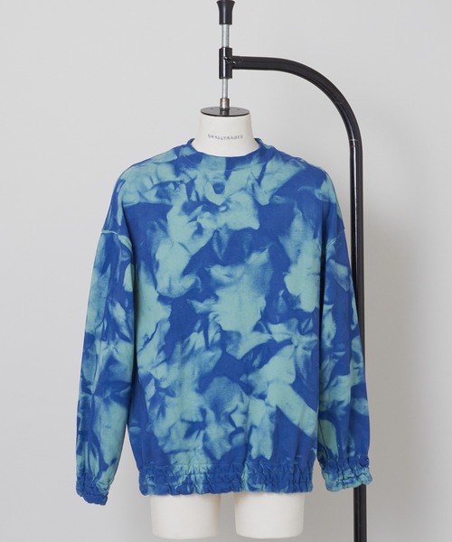ベーシックなフィットのクルーネックスウェットシャツ。職人さんに表面にスプレー染めを施していただき、水面のような柄を表現しました。袖口と裾に3本ゴムを強めに入れているので、ウエスト位置に留めてショート丈としても、そのままロング丈のままでも着て頂けます。生地はベーシックな裏毛生地。程よい厚みの生地なので、オールシーズン着用頂けます。