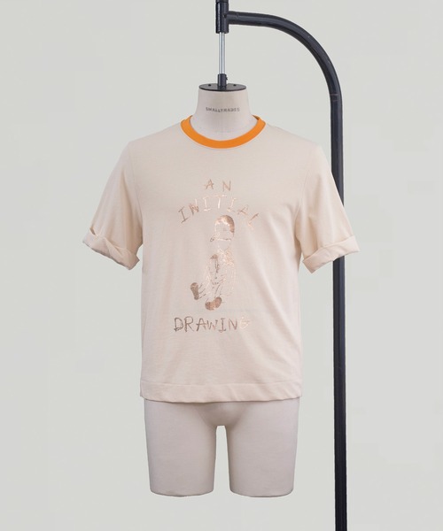 コンパクトなフィットのリンガーTシャツ。袖をロールアップし、2点で縫い留めています。前身頃にデザイナーのハンドドローイングをプリントしています。学生時代に描いた、今の絵のスタイルのきっかけになった絵です。生地は立体感とシャリ感を共存させた引き揃え天竺。