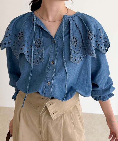 ◇fredy emue◇【2025 AW】着るだけで華やぐ、大人フェミニンな主役デニム!“刺繍×ケープカラー”で差がつく、旬ブラウス●point・ライトオンスデニムにレース刺繍を施した、ケープのような衿が目を引くデザインブラウス・甘さ控えめなデニム素材とカットワーク刺繍のバランスが絶妙で、大人の可愛らしさを演出・前開き仕様なので、羽織りとしても使えてロングシーズン活躍・袖口のギャザーがさりげないポイントに・一枚で主役になる存在感がありながら、デニムオンデニムやキレイめパンツとも好相性・シンプルなボトムを合わせるだけで、こなれた印象に透け感:なし裏地:なし伸縮性:なし光沢感:なし洗濯:手洗い可●お取扱い上のご注意●*商品を長くご愛用していただきたいため、アテンションタグがある場合は必ずご確認の上、着用又はお取り扱い下さい。*画像の商品はサンプルとなりますので実際の商品と仕様(主にファスナー・釦等の付属品)、加工、サイズが若干異なる場合がございます。*店頭及び屋外での撮影画像は、光の当たり具合で色味が違って見える場合があります。商品の色味は、スタジオ撮影の画像をご参照下さい。*商品画像に関しては出来る限り忠実に表示出来るよう努めておりますが、お客様がご利用のモニターの設定及び特性により、実際の商品と比較し色味に若干の誤差が生じる場合があります。*製品洗い加工の商品は、多少の歪み、シワなどが見られたり、風合いやサイズ等が1枚1枚異なります。汗や雨等で濡れた時や、摩擦により色落ちし、他の衣料を汚すことがありますので(特に濃色のもの)ご注意ください。*この製品はインディゴ染めです。他の製品では味わえない自然な風合いがあり、洗っていくごとに独特な色落ち変化を楽しめます。*雨や汗による、濡れた状態での使用は、色落ちや色移行の原因となる場合がありますので十分にご注意下さい。*本製品は選択の繰り返しや着用による摩擦などで色が薄くなっていきます。ご了承ください。*摩擦により淡い色のものとの重ね着や、イス、バック、ベルトなどへ色移りしますのでご注意下さい。*この製品は縫製後、製品洗いをしています。そのため多少の歪み、シワなどが見られたり、風合いやサイズ等が1枚1枚異なります。※サンプルでの採寸のため、サイズ表はあくまで目安となります。予めご了承ください。◇商品のお気に入り登録◇気になる商品は、お気に入り登録がオススメです!クーポン情報、入荷情報が、通知されるようになります。